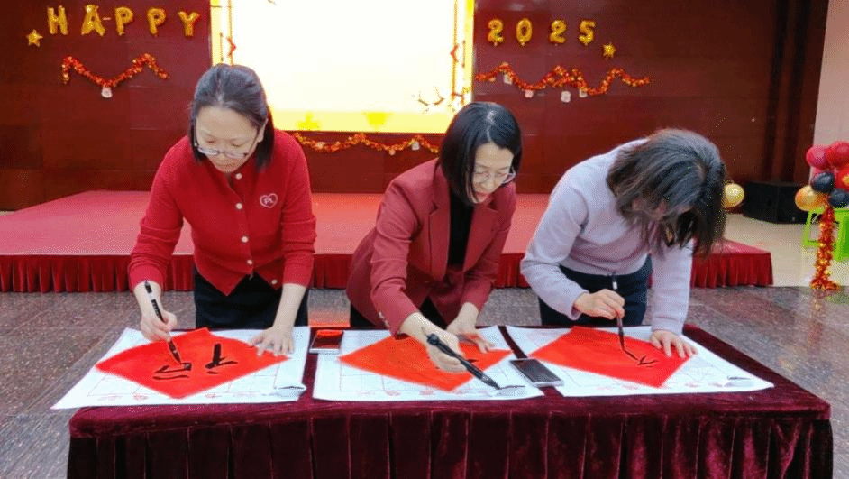 紧接着,“执笔写福”开场仪式巧妙地将传统文化与新年祝福相结合。领导们执笔写福,挥毫泼墨,为全体师生送上了美好的祝福,并指出此次联欢会是学院文化传承与发展的重要一环,也是师生团结协作、奋发向上精神风貌的集中展现。