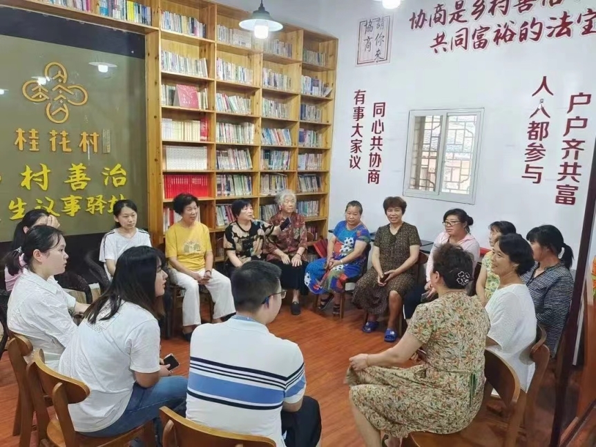 在寿昌镇桂花村,我们走进了十多户村民家中,通过非参与式观察、集体访谈的方式了解村风村情,勾勒基层治理工作的图景;在老年食堂和助餐点,了解了食堂运作情况、服务理念和工作制度,感受到桂花村尊老敬老爱老的德文化;走在村里,整洁的环境、便利的服务设施以及村委工作宣传板无不呈现着桂花村的特色:“没有一个保洁员,人人都是保洁员”、“人和为桂,村景如花”、“片组微治理”;在党群服务中心,我们更全面和深刻地感受到桂花嫂们在美丽庭院、垃圾分类、乡村治理、产业发展等工作中的重要作用。