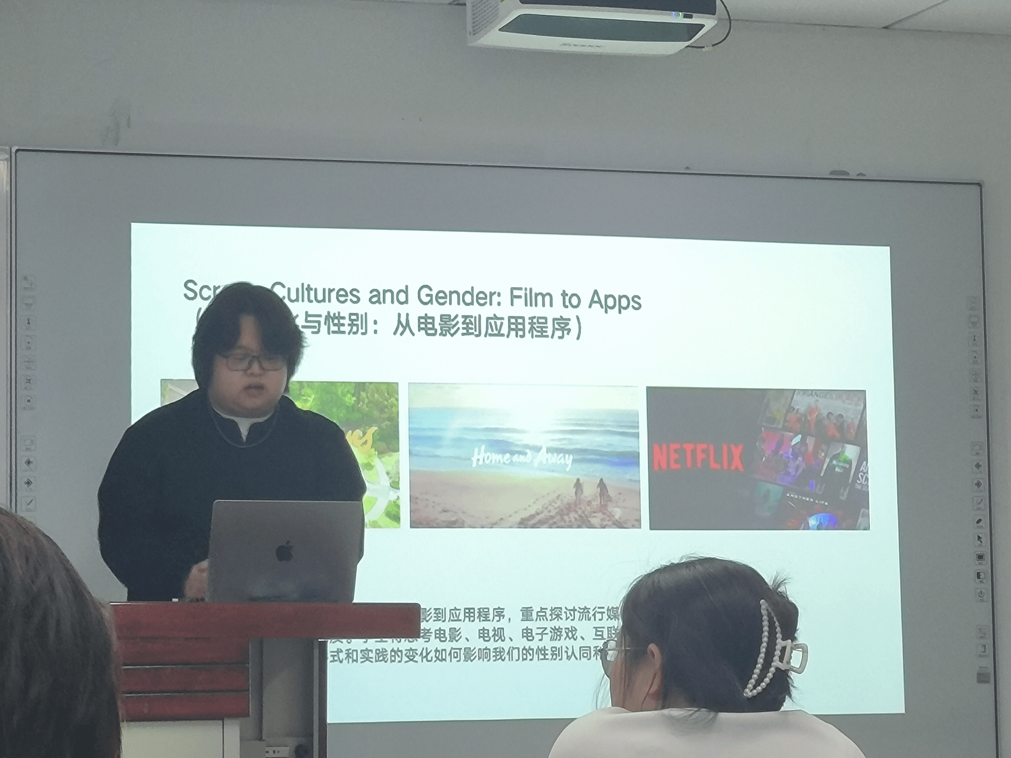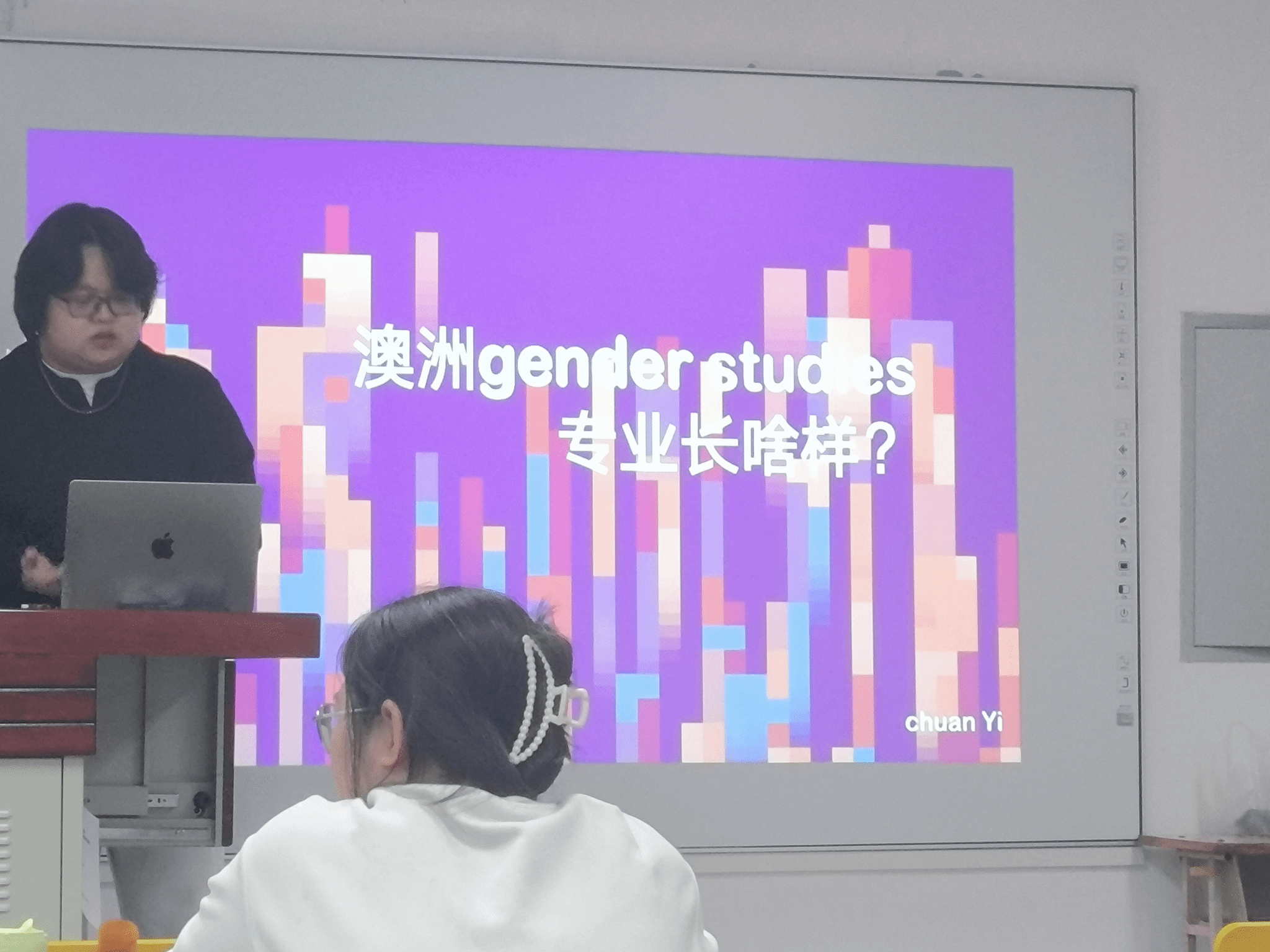 小易结合自己的求学经历,与同学们分享了自己在悉尼大学性别研究课程中的学习体验,尤其是参与《酷儿电影》《屏幕文化与性别:从电影到应用程序》《亲密关系、爱情与友谊》等课程的感受,并介绍了这些课程是如何通过分析不同媒介中的性别表现,帮助学生深入理解性别与社会结构之间的关系。