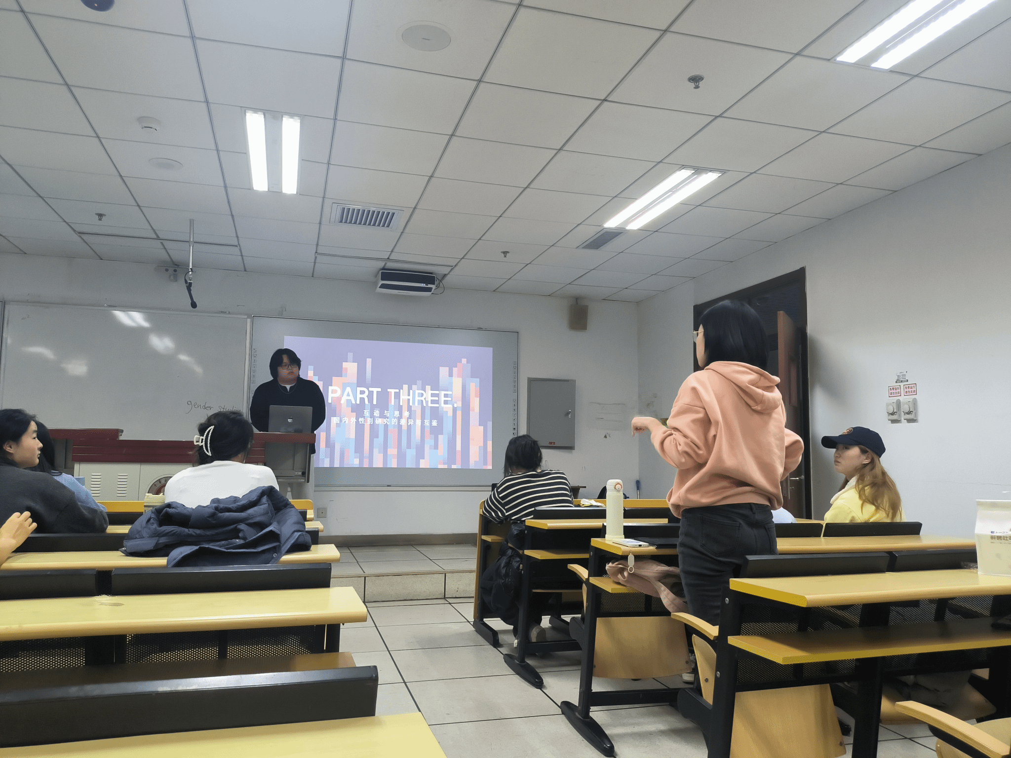 在互动提问环节,大家围绕着两国不同的性别研究语境、具体的研究议题、课程设置与教学风格等大家关心的议题进行了热烈的讨论,全程氛围活跃且充满洞察力。通过本次分享会,同学们对澳洲的性别研究有了更深的认识,也更理解了性别研究的多维度和跨学科特性,易秦镐川同学的精彩分享和对问题的深入回答让同学们感受到了性别研究在全球化背景下在澳洲的独特面向。