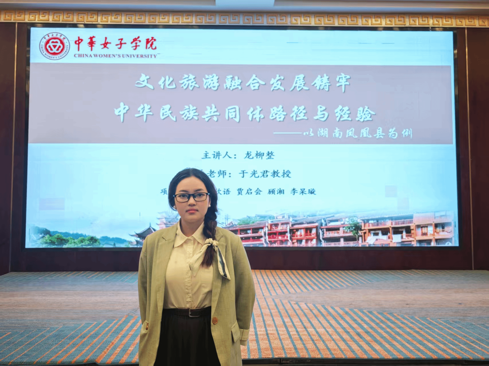龙柳整同学参与撰写的学术论文《文化旅游融合发展铸牢中华民族共同体的路径与经验——以湖南凤凰县为例》,由于光君教授指导,龙柳整、陈欣语、贾启会、顾湘、李杲璇同学共同完成。该论文在全国征文活动中入选,并获得评审专家的认可。龙柳整作为课题负责人,被邀请在大会上发言,她是本次会议中唯一一位发言的在读本科生。此外,该论文还获得了 2025 年挑战杯学校一等奖和北京市二等奖。