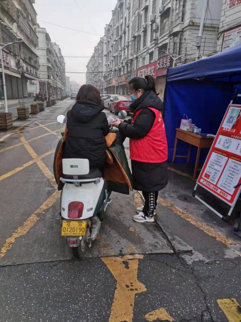 我院2019级来自河南信阳的蔡子宜同学主动申请,积极参与社区疫情防控志愿活动,在防疫点登记排查进出人员、测量体温、协查信息、卫生消毒、维持现场秩序等。由于社区居民量较多,每日检测人数达上千人,而志愿者却严重不足,蔡子宜同学常常在寒冷的室外一站就是一整天,这让她深刻地感受到了防疫工作者的艰辛与不易。