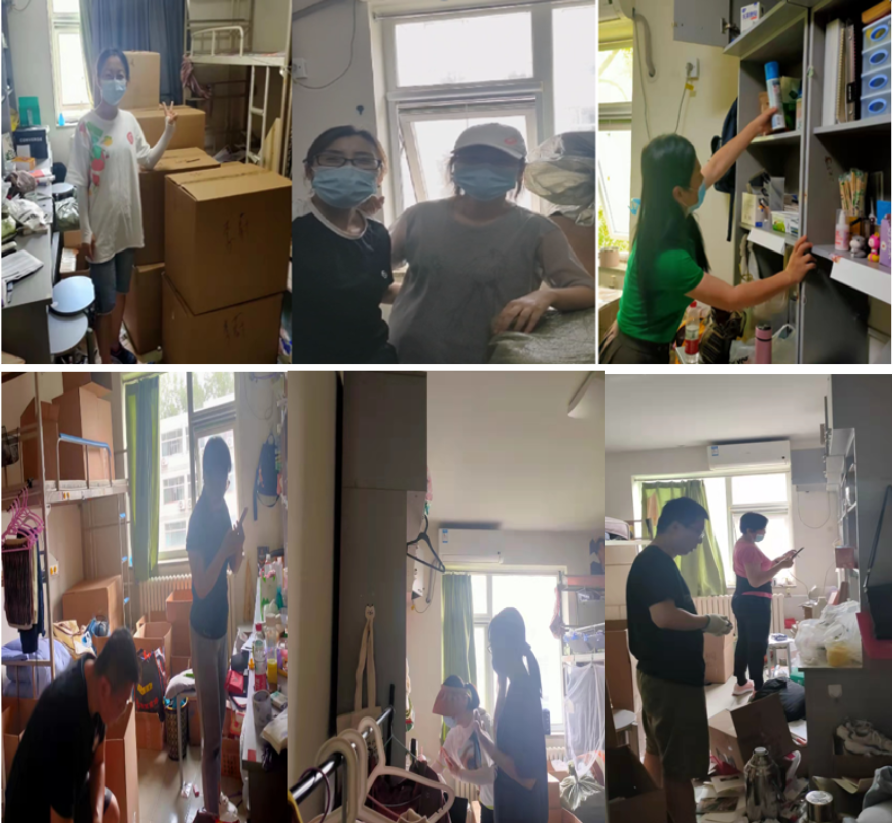 打包、邮寄过程中,老师们和学生志愿者为了让毕业生可以全方位看到自己的宿舍和个人物品,全程通过视频的方式与毕业生连线确认物品位置,提供点对点、一对一的服务,在所有行李上写下编号与收件人信息,确保不落下任何一位同学的物品。