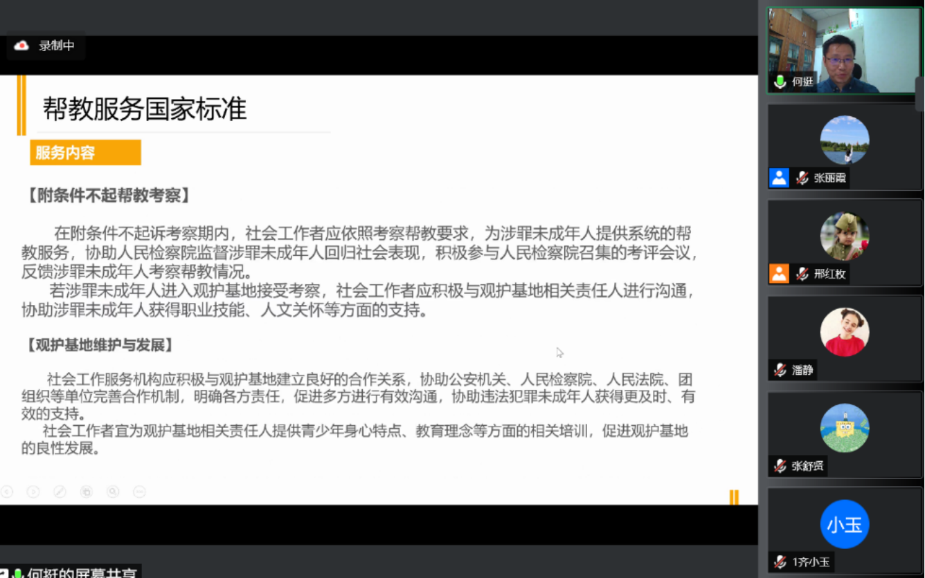 何挺教授本次讲座主要围绕未成年司法社会支持体系的内容及其建设展开。他首先讲解了未成年人司法社会支持的概念和范围,从未成年人司法的特殊性和核心特征出发,对司法社会工作的概念和范围进行了深入分析。然后,何挺教授通过案例分析讲解了司法工作和社会工作理念的不同及在未成年人司法领域的交融发展。最后何挺教授基于法律规定,结合司法实践和调研发现对国家标准《未成年人司法社会工作服务规范》(征求意见稿)中的合适成年人、社会调查、附条件考察帮教服务等方面的内容进行了深度解读。