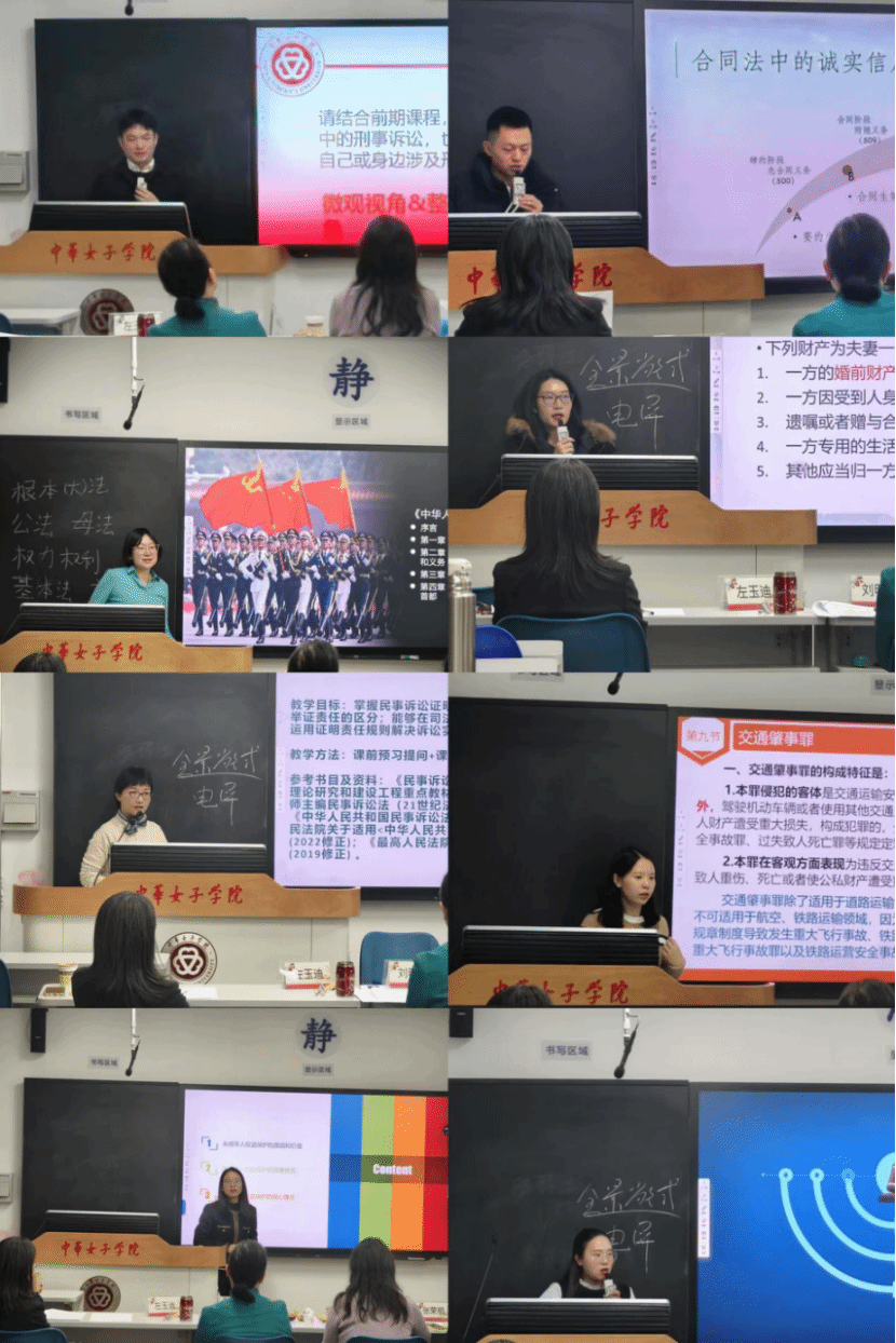 2024 年 12 月 10 日下午,中华女子学院法学院于主楼 310教室成功举办了中华女子学院第十一届青年教师教学技能大赛初赛。比赛邀请了五位教学经验丰富的评委:分别是我校教学督导北京化工大学樊丽君教授、法学院退休教师刘明辉教授、张荣丽副教授、法学院教师左玉迪副教授、但淑华副教授。此次比赛共有八位40周岁以下青年教师参加,旨在提升青年教师课堂教学技能,促进教学经验交流。