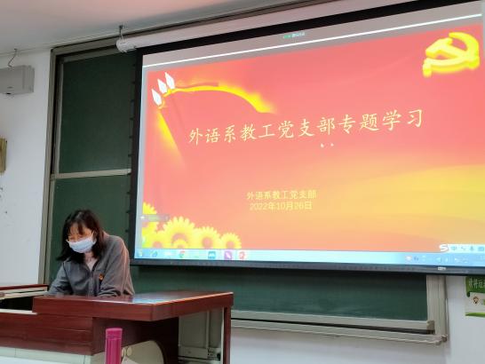 2022年10月26日下午,外语系教工党支部在主楼310举行了专题学习,教工党支部书记张娇主持,全体党员参加专题学习。