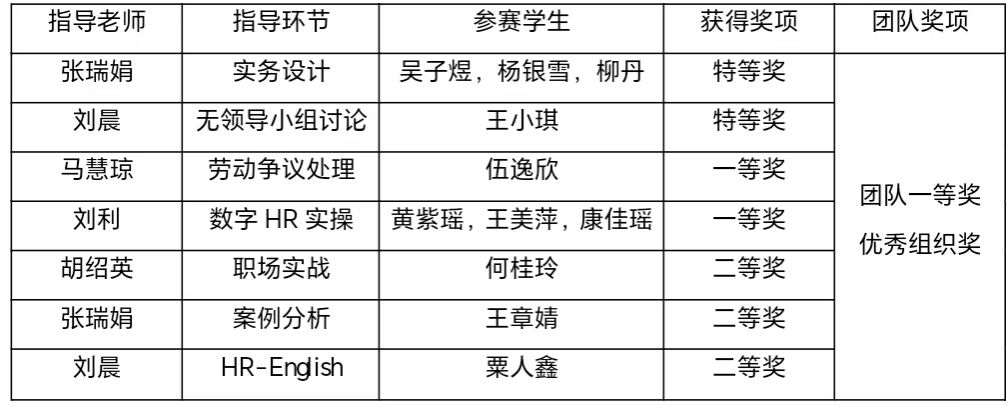 在本次赛事中,我校推选参赛的11位优秀选手从容应赛,遇强则强:获得实务设计赛道与无领导小组讨论赛道的特等奖,获得数字HR实操赛道与劳动争议处理赛道的一等奖,以及案例分析赛道、职场实战赛道与HR-English赛道的二等奖,并获得了团体一等奖;老师们在备赛过程中辛苦付出,积极指导各位学生,每位老师获得“优秀指导老师”称号,指导老师团队获得“优秀组织奖”。