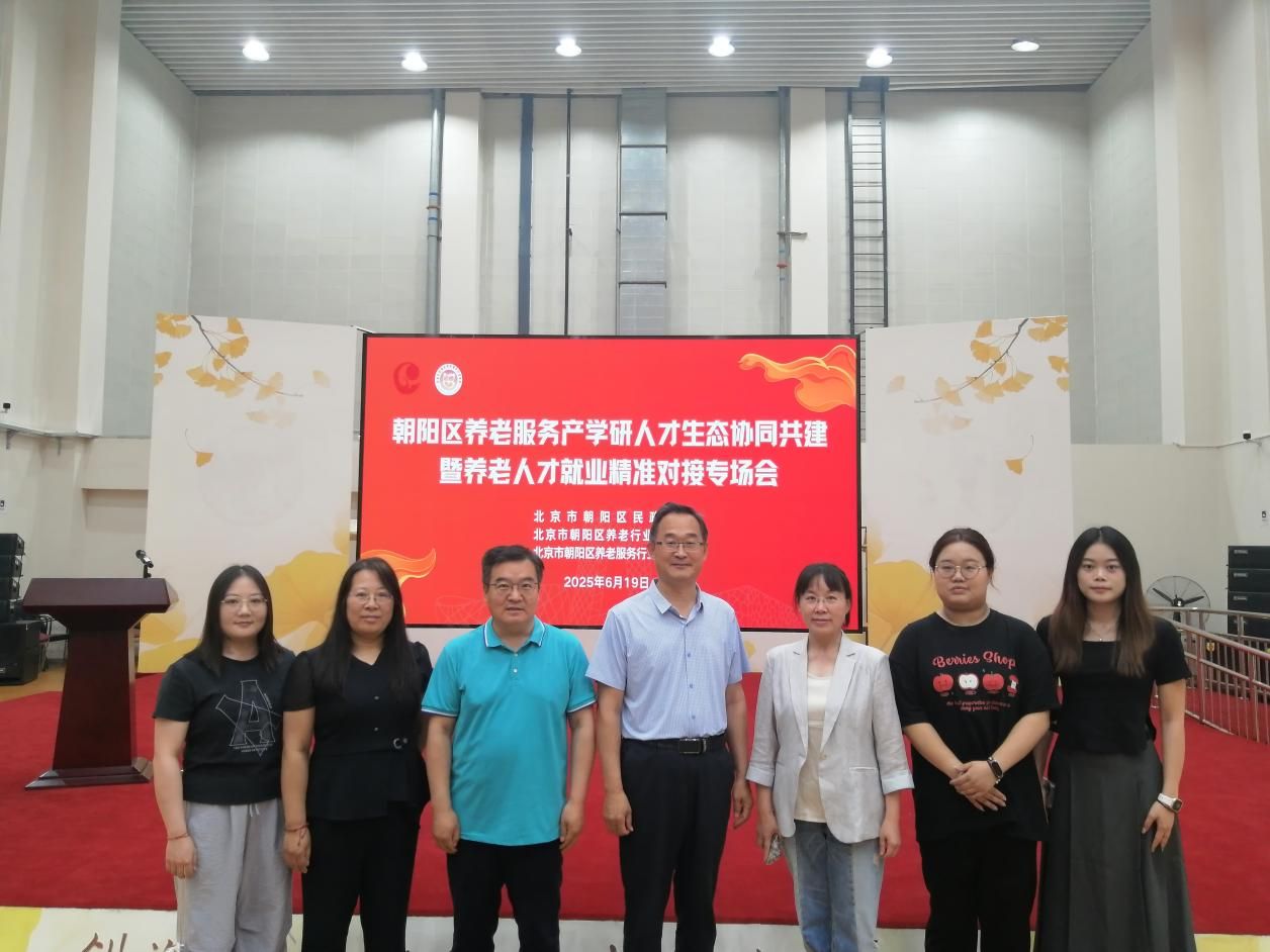 2025年6月19日下午,管理学院院长侯典牧、养老服务管理专业教师汪连新、向宝惠、朱迎波带领养老服务管理专业2021级即将毕业同学参加了北京市朝阳区养老服务协会举办的养老服务产学研协同共建暨养老人才对接专场会。