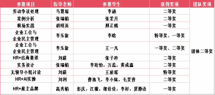 本次赛事中,我校参赛团队在9个赛道奋勇争先,共斩获特等奖2项、一等奖4项、二等奖7项、团体二等奖1项的佳绩!个人荣誉与团队成绩交相辉映,充分展现了我校学子在人力资源管理领域的专业素养与协作能力。在“企业工会与企业民主管理”“无领导小组讨论”两大赛道中,李晗同学、王凌瑶同学凭借专业积淀斩获特等奖,彰显了扎实的理论功底与实战能力;“职场实战”“企业工会与企业民主管理”和“雇主品牌”赛道表现尤为突出,邢芷嫣、王一凡分别拿下个人一等奖,彭庆,江璇,郎佳佳,李好,夏静语等同学拿下团体一等奖,成为该赛道的核心竞争力;劳动争议处理项目、实务设计、HR+AI实操、案例分析、HR+出海赛道等项目中均荣获二等奖,展现了在人力资源管理等领域的专业素养与协作能力。