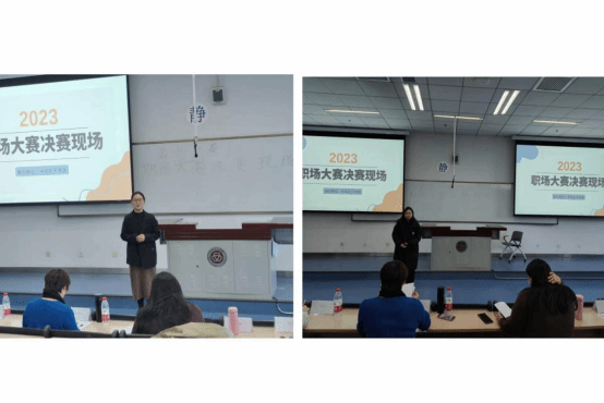 用心育人,以爱执教。此次决赛现场邀请到了管理学院职业生涯与就业指导教研室张才纯老师和胡绍英老师,以及管理学院团总支书记孙可老师,三位教师在点评选手们现场表现的同时也给予她们鼓励和认可,并给出了宝贵的建议,指明了选手们未来发展方向。