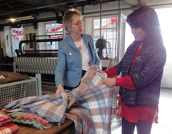 ▲威尔士国立羊毛纺织博物馆馆长莎莉在介绍羊毛毯的传统使用方法
