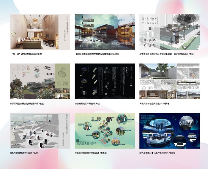 环境设计专业以“共生”为分主题,在新农村公共空间开发改造、儿童美术馆空间改造、儿童美术馆艺术衍生品研发、中华女子学院图书馆陈设艺术、科技馆主题展示空间与系统再设计、新能源汽车补给站设计等一系列领域进行探索,还在瓶子回收与信息发布混合装置研发设计、基于回收材料再利用的陈设品研发设计等方面进行了跨界尝试。