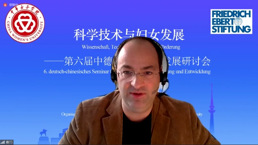 德国弗里德里希·艾伯特基金会(北京办事处)中国区首席代表赛巧先生参加会议并致辞。他指出,“妇女应该能够从经济和社会数字化发展的机会中获得更多的益处和发展机会”是德国联邦政府第三个性别平等报告中的核心内容。在疫情的影响之下,伴随着数字化的浪潮,工作方式发生了较大的变化,工作场所和家庭的边界变得模糊不清,劳动法的保护在一定程度上也被削弱。但在另一方面,科技发展却给我们提供一个机会塑造更加包容的劳动力市场,以及灵活的、数字化的工作方式。妇女可以从经济和社会数字化发展带来的机会中获得更多的益处。但是,目前妇女在科技领域就业仍然存在一些男女不平等现象,限制了妇女在科技领域的发展。中国和德国都为此做出了诸多努力,希望通过这次会议使中德学者分享经验与策略,进一步推动中德双方在促进性别平等和妇女发展方面的国际合作与学术交流。
