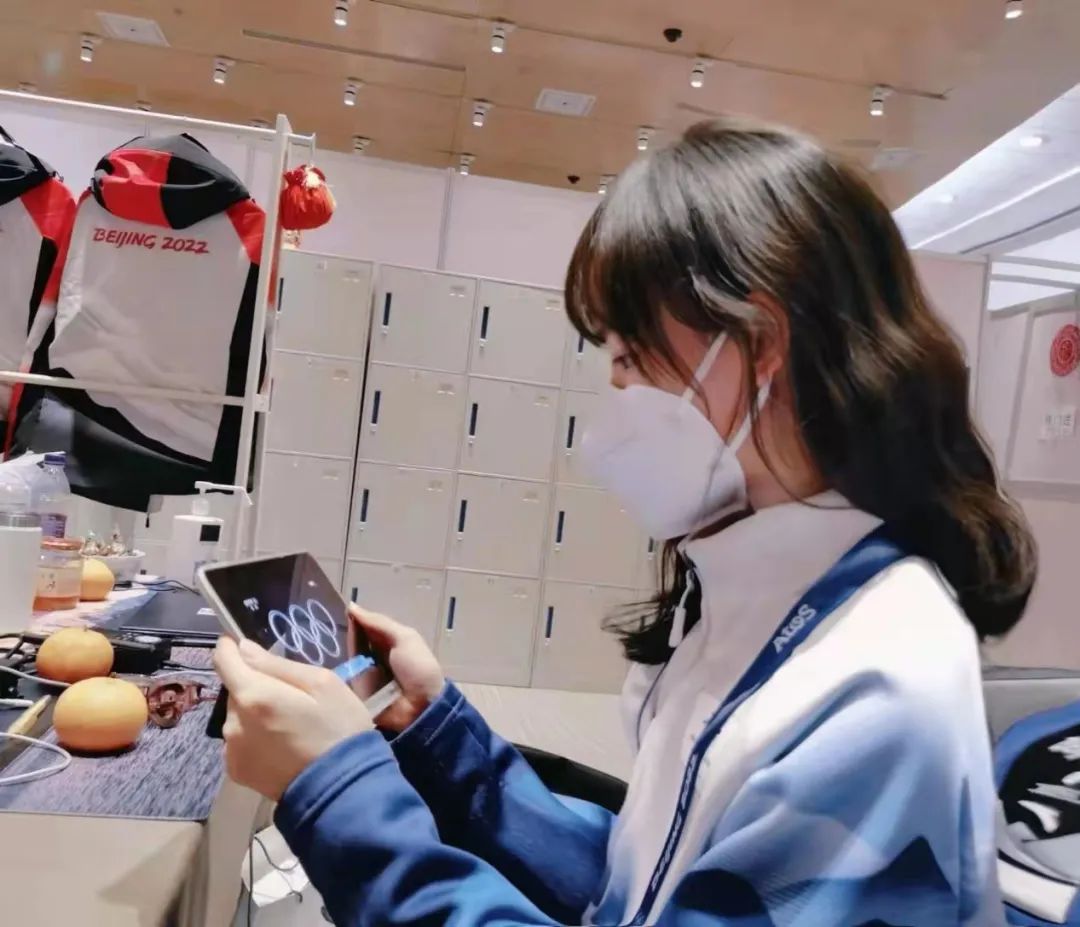 场馆通用志愿者王凯妮在志愿者休息室收看开幕式直播