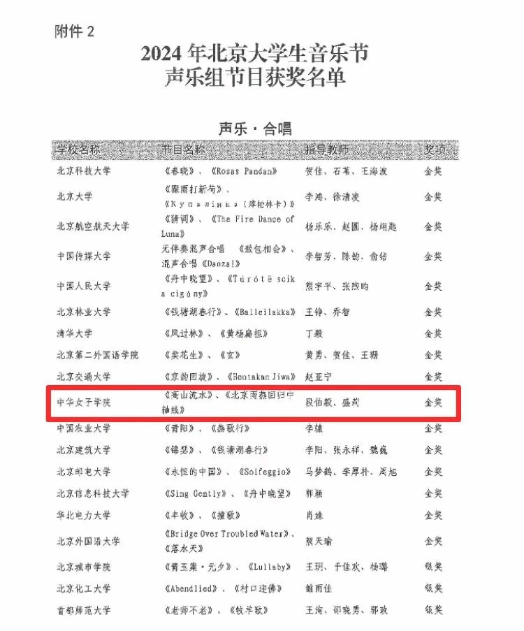 北京市教委近期公布了2024年北京大学生音乐节评审结果。我校选送的女生合唱原创作品《高山流水》《北京雨燕回归中轴线》在首都高校选送的上百件作品中脱颖而出,最终荣获声乐组金奖。词曲作者、指导教师段伯毅老师一举获得“优秀指挥”、“优秀创作”、“优秀指导教师”等多个奖项。