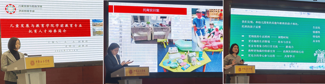儿童发展与教育学院史明洁副教授展示了我校托育实训教学中回应性照护的相关内容以及0-3岁婴幼儿早期发展与托育微专业的课程筹备情况。