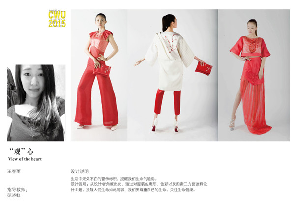 在前两届的中国大学生时装周活动中,中华女子学院艺术学院获得了充分的肯定和精彩的成绩。连续两年获得了 “年度市场潜力奖、年度优秀发布奖”的殊荣,受到媒体、企业和行业专家的好评。本次毕业设计的筹备与指导工作更是一次在教学改革与实践中的尝试。秉承为服装行业培养应用型创新设计人才的理念,教学团队将毕业设计作为对人才培养质量的考核,注重在启发学生创新的同时以更扎实的态度认识服装行业,了解大众的需求。同学们在本次设计方案中鲜明的突出了设计对人的关怀与美的情感体验。例如夜色的能发光的时尚骑行服装、兼具美丽与便利的为轮椅病患设计的休闲服、从银发老者到活力青年的家庭滑雪服系列和应对不同气候条件的情侣自驾多功能旅行装。在传统与前卫的触碰和感悟中,同学们也积极尝试将文化传承与时尚的结合,尤其注重实用性与创意的平衡,作品形式更为成熟和成品化。