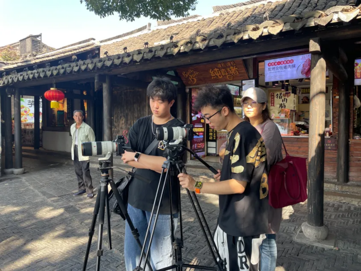 11月2日下午,老师和同学们抵达西塘古镇,随即按照计划紧锣密鼓地开展实践活动。带队老师与摄制小组走进古镇,提前采点、拍摄空镜、设计拍摄场景;负责服装造型指导的老师根据诵读的诗词、相应历史时期的服饰风格为学生调整造型、搭配服饰。