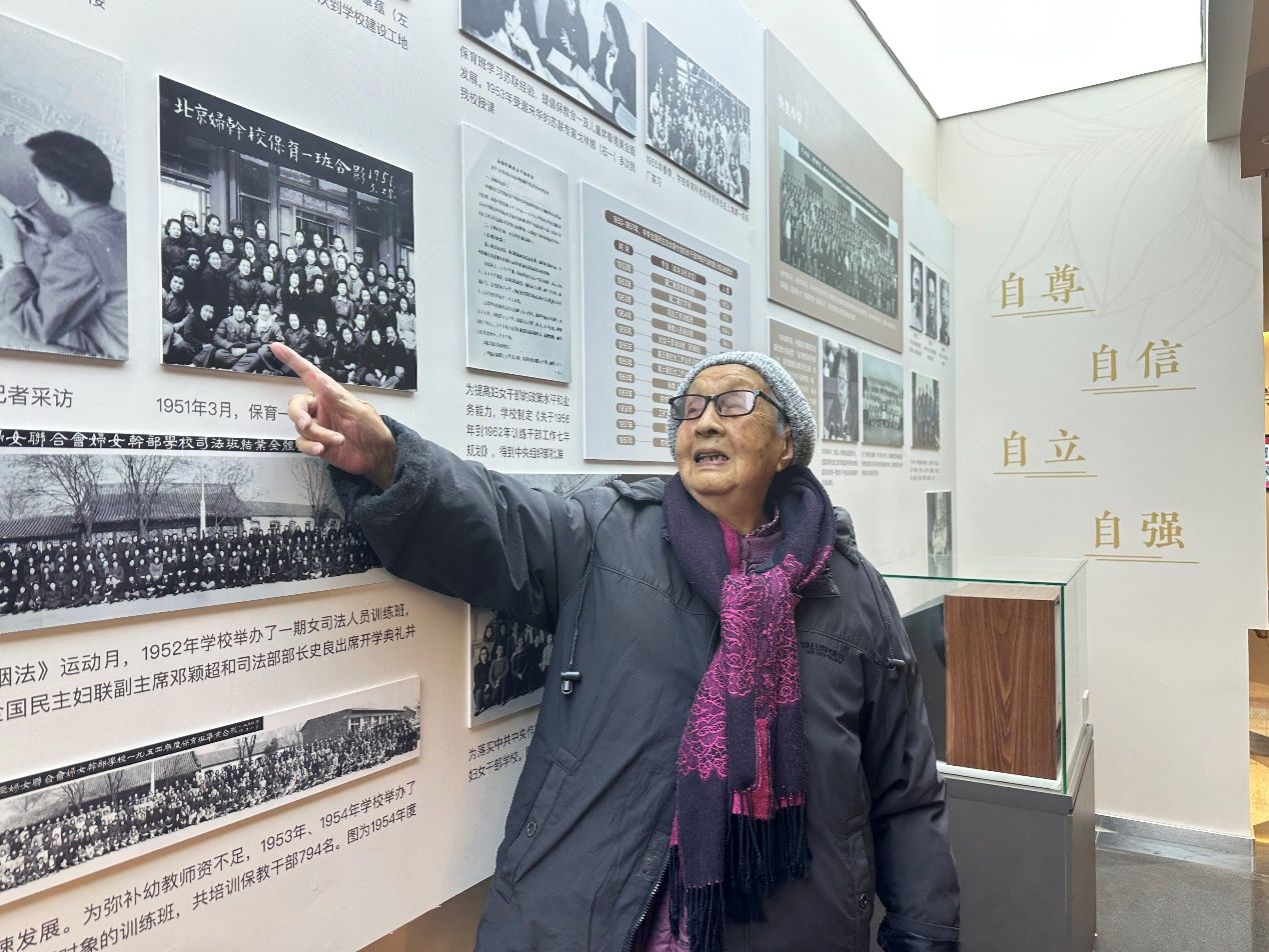 蔡均女士驻足在一张张老照片、一幅幅还原的场景前,不时讲述着当年的故事。她指着一张照片说:“这是我们第一期保育班学员的大合影,这个戴白围巾的就是我。”“这是戈琳娜,她给我们上课,当时还有蔡畅、邓颖超给我们讲妇女运动,毛主席的老师徐特立,也给我们讲课。”校史在她的讲述中更加鲜活、生动。