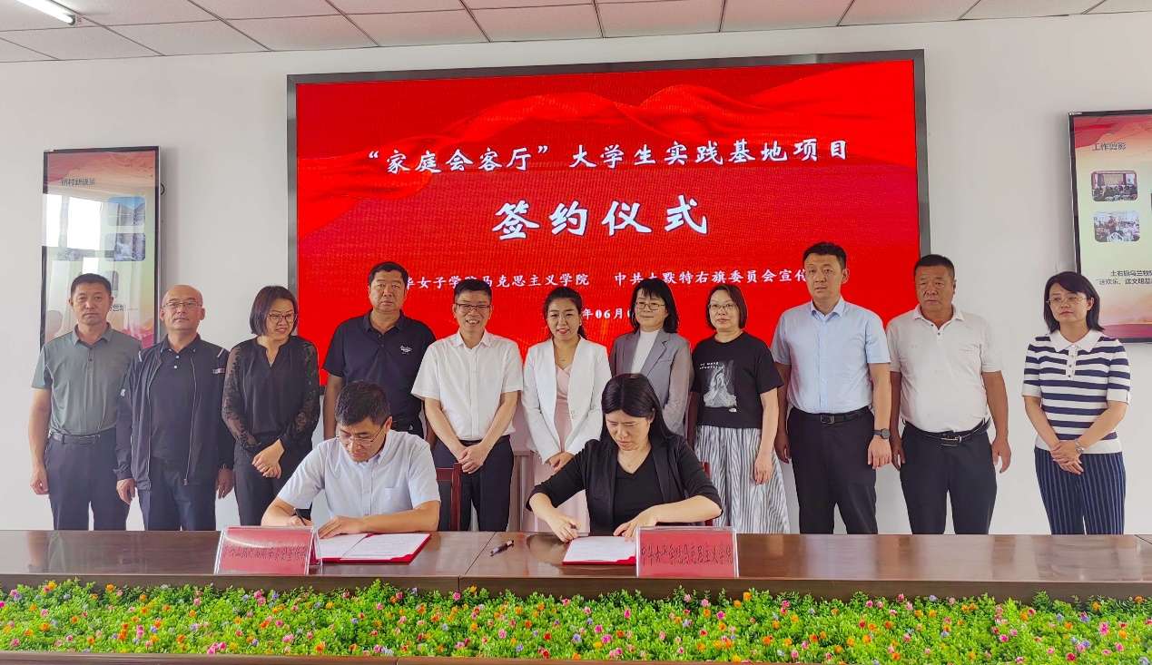 当天,为铸牢中华民族共同体意识,推动乡村家庭家教家风建设,2023年中华女子学院马克思主义学院与土默特右旗委员会宣传部、土默特右旗妇联签订了项目合作协议,共同打造“家庭会客厅”大学生实践基地。