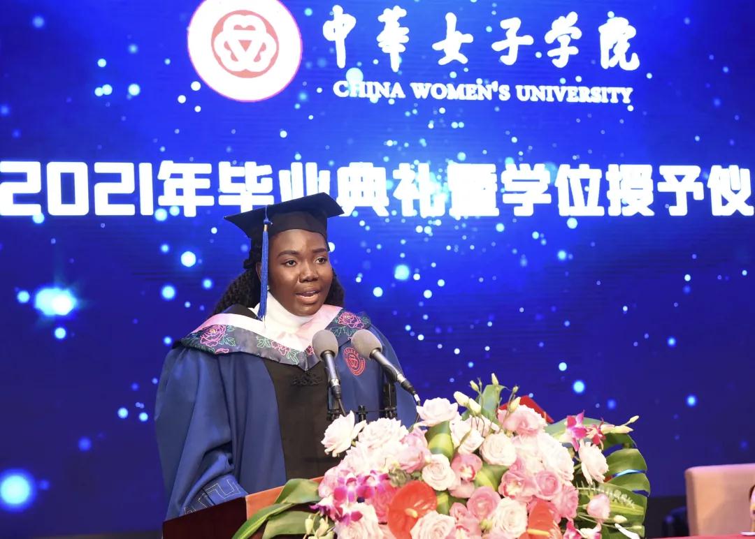 来自加纳的援外学历学位硕士研究生国际学员代表普林西斯发言。她代表援外班毕业生感谢中国政府、商务部奖学金秘书处、全国妇联和中华女子学院,感谢在新冠肺炎疫情期间给予同学们另一个家,做同学们的坚强后盾。特别是女院在疫情期间的付出、爱和关怀令同学们难忘,也教会同学们鼓起勇气,面对困难和挑战。感谢学校指明的人生道路,培养并激励女性,为她们赋权。作为从中华女子学院毕业的女性领导者,毕业后与学校,与校友之间的联系将永存下去。当回到各自的国家,她们将成为知识的传播者、友好的见证者。