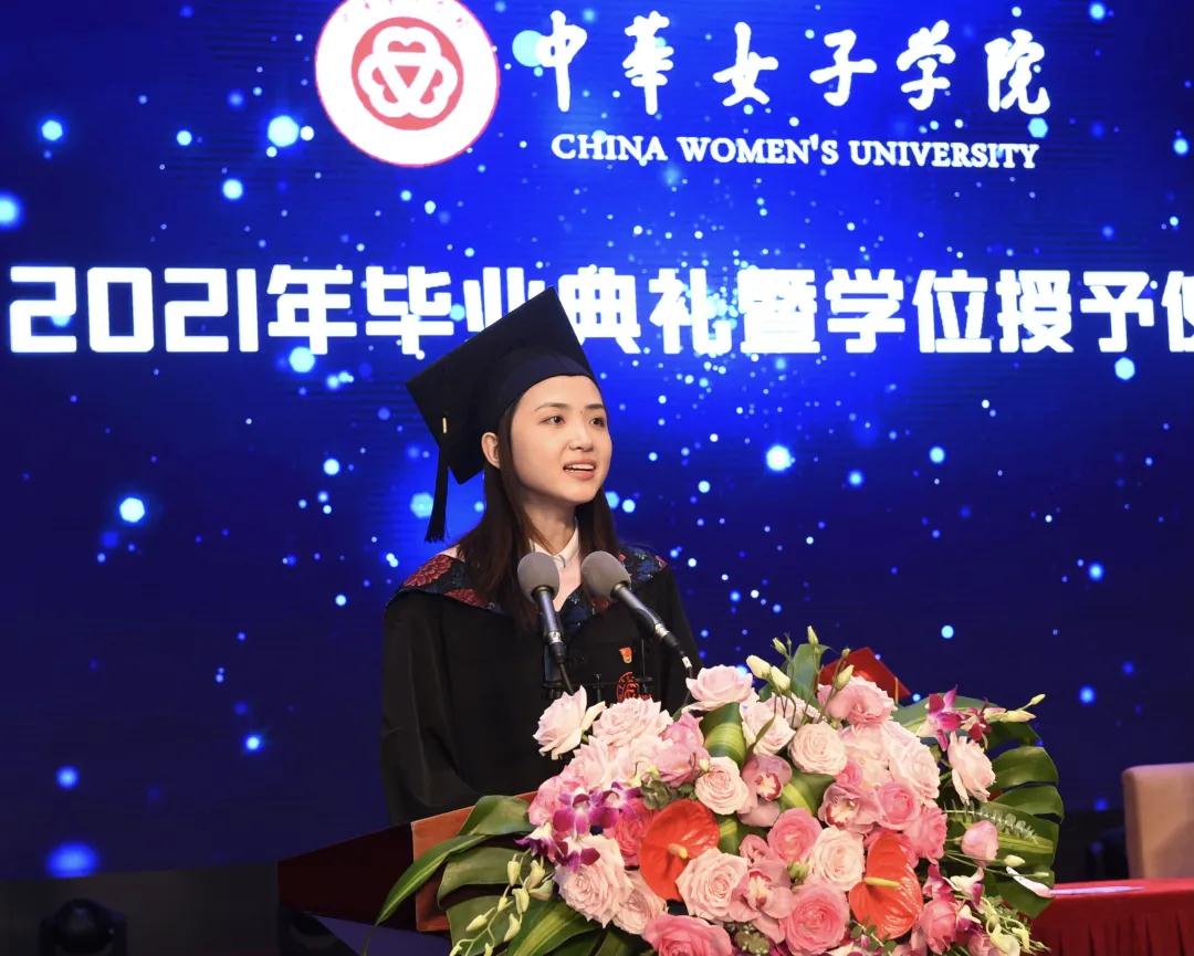 在“我要上典礼”活动中脱颖而出的法学院法学专业李忆漩作为本科毕业生代表发言。她介绍了自己的入伍经历,并从秉持自尊自信自立自强的“四自”精神,传承女院忠于理想的家国情怀,展示中国女性力量与自信的角度出发,讲述了退役复学后参加国庆70周年阅兵训练的体会。毕业后,她义无反顾的选择走入基层,通过接触社会、了解社会,并代表毕业生表示不会辜负母校的培育,定将绽放中国女性的卓越风采。