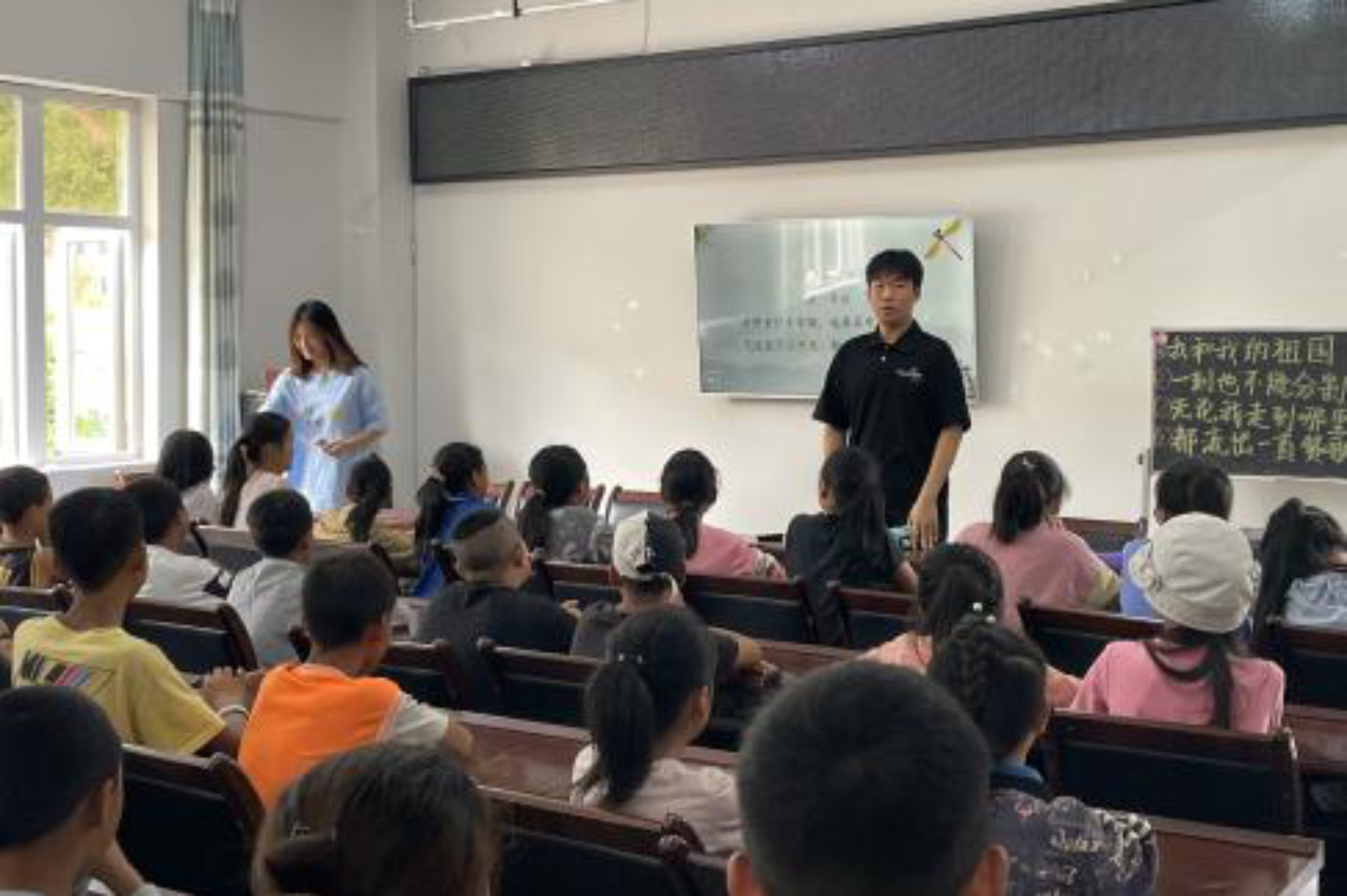 在四、五年级的课堂上。实践团成员通过趣味口部操引入普通话教学,在练习、掌握发音技巧后,带领同学们朗诵诗歌《祖国啊,我亲爱的祖国》,引导同学们在激昂的诗歌中激发对祖国的热爱与崇敬,感受我与祖国心连心。为鼓励同学们更好、更勇敢地抒发自己的情感,借助“击鼓传花”地小游戏,来帮助同学们勇敢发声、传递情感。课堂在“一封家书”的活动中圆满结束。
