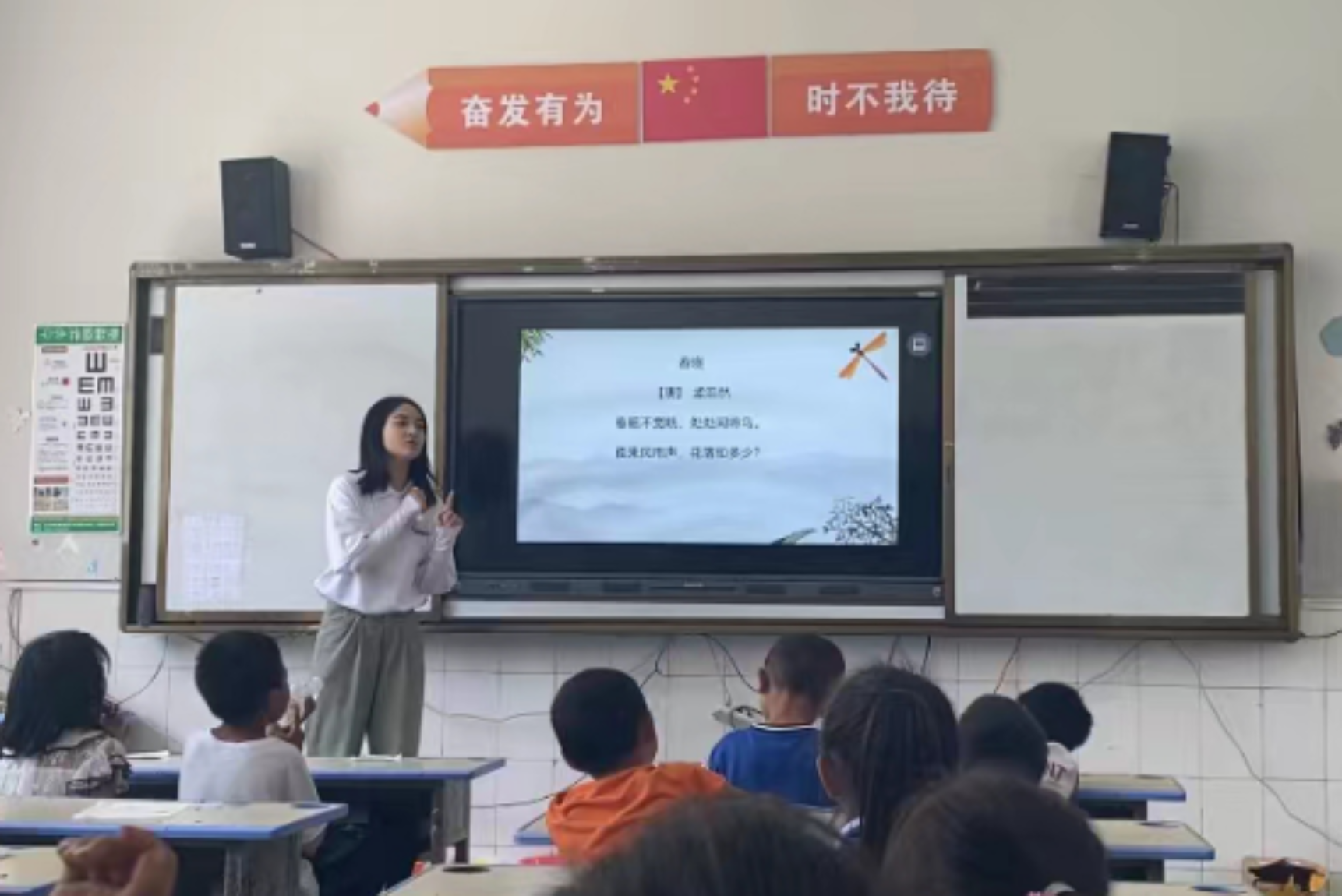 在龙潭镇,普通话课程也走进了不同年级的课堂。在二、三年级的课堂上,实践团成员首先通过“雨点变奏曲”的小游戏让小朋友们迅速地进入学习普通话的状态。之后又通过简单的口部操教学,让孩子们真实地感受唇舌发力,并带领同学们学习有节奏的绕口令与四季有关的古诗词等,进一步帮助孩子们开口朗诵,并且结合手部动作,便于孩子们更好地理解和感受诗歌内容和朗读节奏。