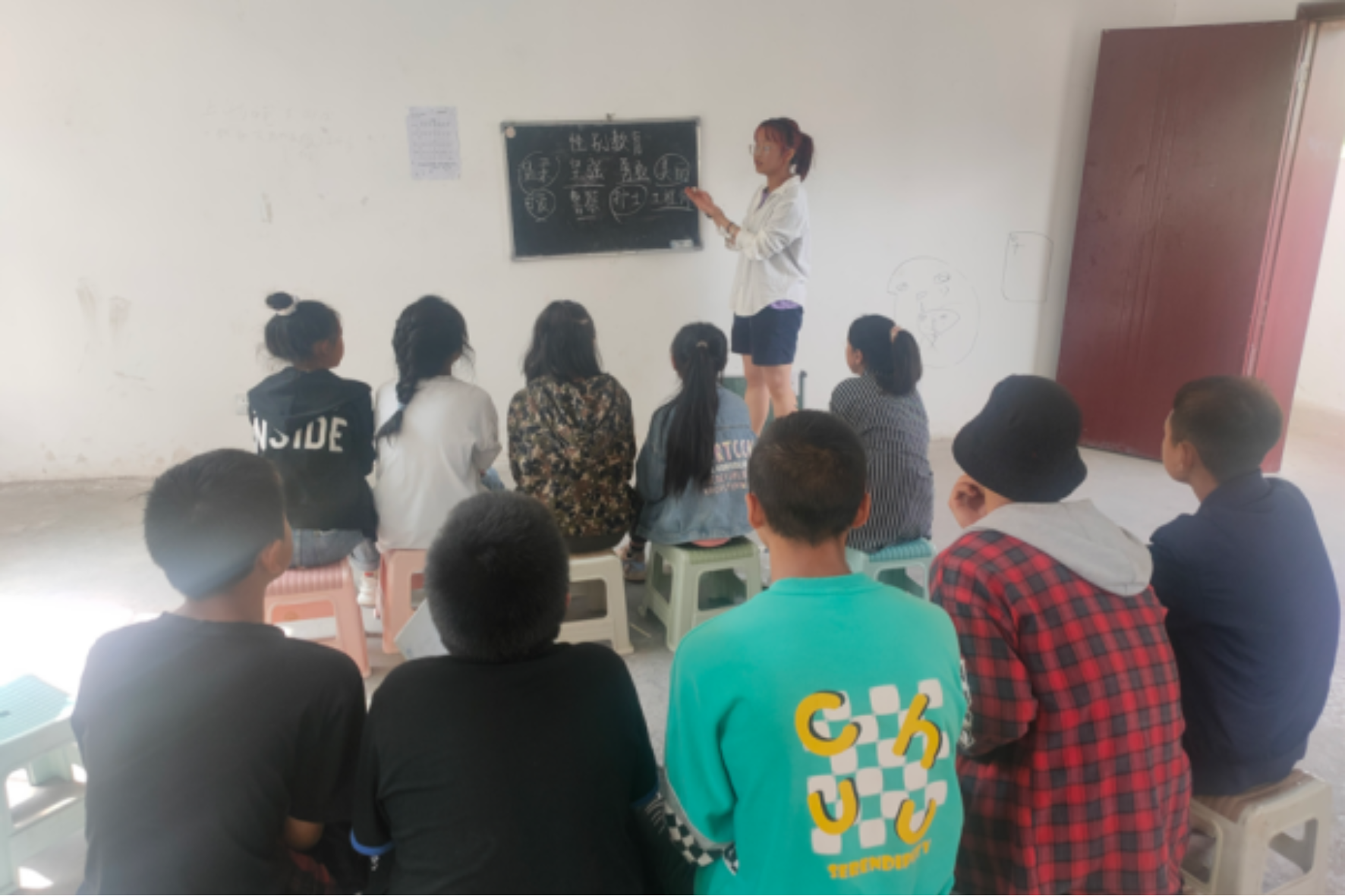 石门社区的队员们运用丁丁豆豆儿童性别意识教育桌游作为课堂引入,通过桌游卡片提醒孩子们警惕不法侵害,同时指导他们如何自我保护。通过提问有关男女性格、行为方式、色彩喜好等方面的不同,让孩子们了解性别刻板印象,积极引导孩子们自由寻找性别发展的可能性。在由二年级到六年级组成的班级中,队员针对班级中女孩子青春期可能面临的身体发育问题进行科学讲解,引导孩子们正确认识青春期的相关现象。