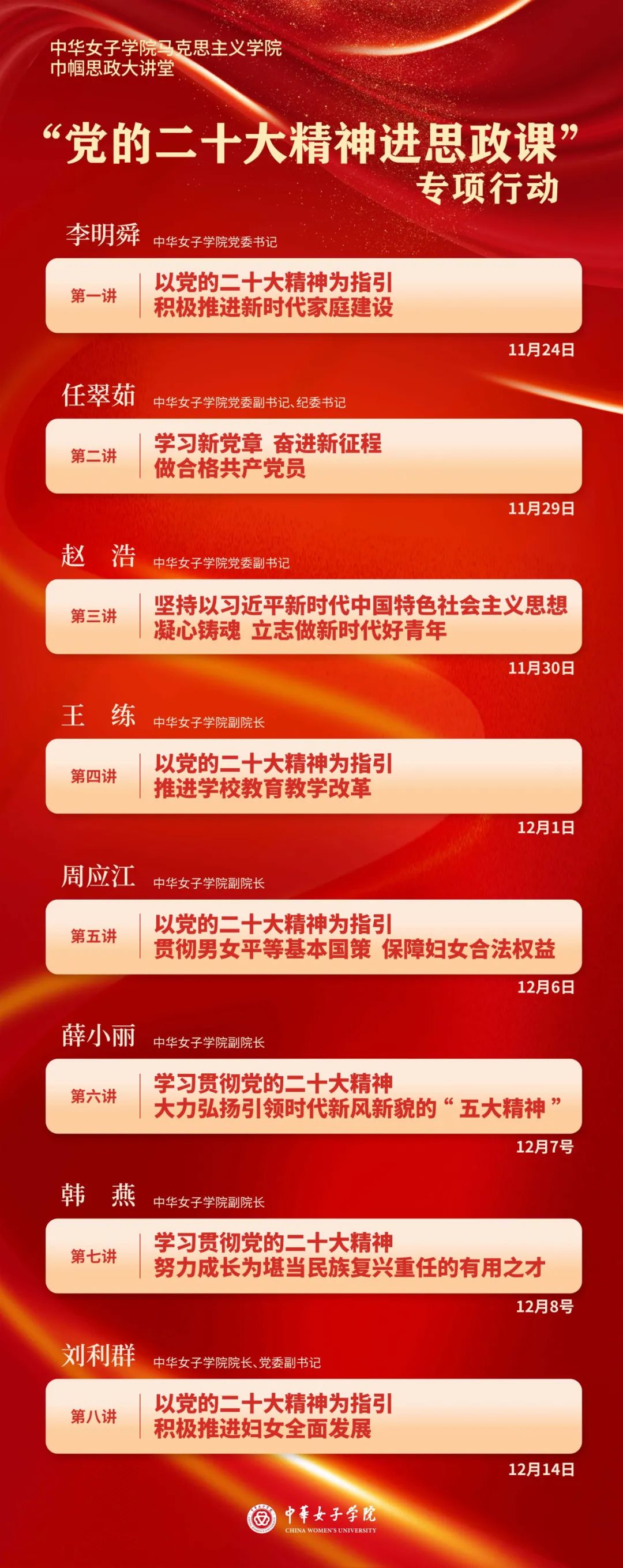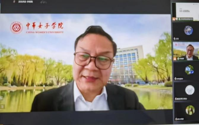 11月24日中华女子学院党委书记李明舜主讲第一讲,题目为“以党的二十大精神为指引 积极推进新时代家庭建设”。