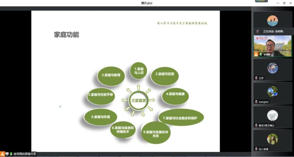 接下来,他解读了党的二十大报告中与家庭直接相关和密切相关的重要论述,提出积极推进新时代家庭建设。他指出,新时代家庭观是新时代家庭建设的根本遵循。新时代家庭观的核心内容就是习近平总书记关于注重家庭家教家风建设的重要论述。新时代家庭观是习近平总书记运用辩证唯物主义和历史唯物主义的世界观和方法论,对家庭的功能、地位、发展趋势以及家庭建设的内容、途径、价值取向等基本问题所做出的科学分析和概括。我们要加强习近平总书记关于注重家庭家教家风建设重要论述的学习宣传,树立、培育和践行新时代家庭观,让新时代家庭观成为亿万家庭日用而不觉的道德规范和行为准则。