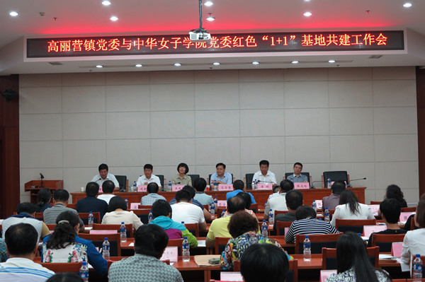 2015年6月30日上午,学校党委与顺义区高丽营镇党委红色“1+1”基地共建项目启动对接会在高丽营镇政府成功召开。学校部分党支部书记、高丽营镇村(社区)党支部书记近百人参加了共建基地的启动对接。学校党委常委常委、副院长王京霞出席会议并讲话。