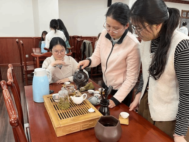 4月15日,茶艺品鉴活动在主楼251中华文化情景教室举办,特邀博雅课《茶道与女性生活》任课教师孙晓梅教授作为主讲人,带领20名同学开启一场别开生面的茶文化课堂。孙教授深入浅出地讲解了茶具的名称与摆放方式、茶叶的种类及其冲泡步骤,展现了传统茶艺中蕴藏的生活美学与文化精髓。同学们不仅感受到中华民族对生活之美的追求,更深刻体会到中国茶文化的博大精深。她们表示:“从一杯茶中体会到‘静水流深’的东方美学,这是课本难以传达的独特感悟。”