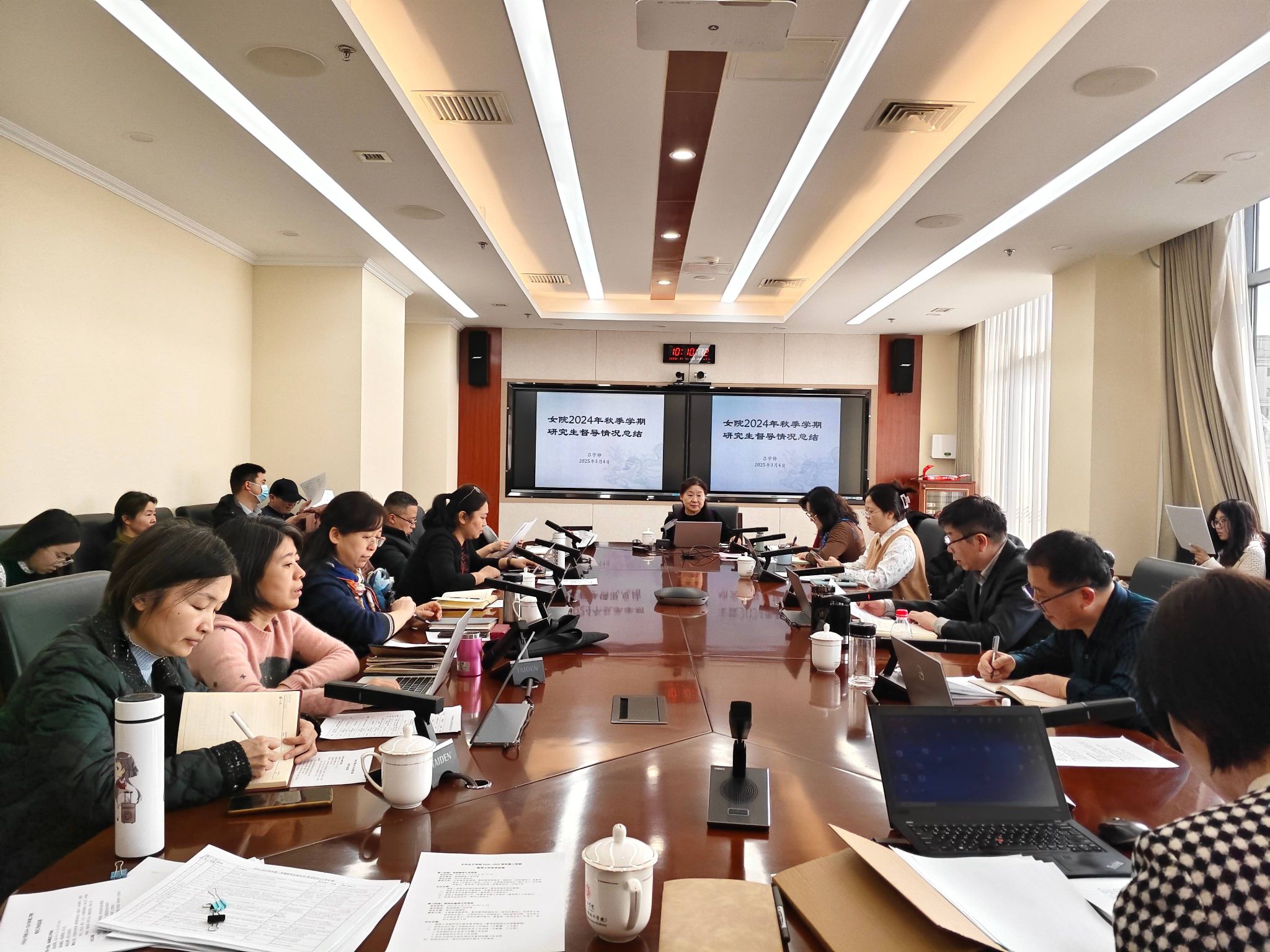 在第二时段研究生教学工作会议上,教学督导组副组长吕学静教授通报了上学期教学督导工作,并提出了提高研究生教育培养质量的具体建设意见。教务部副部长王献蜜总结了上学期研究生教育工作,通报了本学期研究生培养、学籍、学位、招生等方面的工作安排。教务部部长丁占罡着重强调了硕士点专项合格评估,社会学一级学科硕士点建设、经费预算执行和研究生招生等重点工作。最后周应江副校长指出:一要认清形势,明确肩上担子,深化教育综合改革,提高我校研究生的培养质量;二要主动作为,充分发挥引领示范作用,积极为妇女事业发展贡献力量;三要做好迎接学位点专项合格评估的各项工作,全体教职工要打起精神,扎实做好研究生的招生培养与学位工作,细化责任点与责任人,明确各项工作要求。