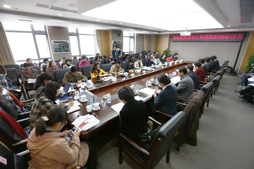 2014年10月30日下午,全国妇联和中国妇女研究会联合共建妇女/性别研究与培训基地的全国22所高校在京举办“高校预防和制止性骚扰机制研讨会”,并就高校预防和制止性骚扰提出八项具体建议。全国妇联书记处书记、中国妇女研究会秘书长谭琳出席会议并讲话。全国妇联权益部部长高莎薇、教育部教师工作司司长许涛和22所高校的领导和代表共50余人参加会议。会议由全国妇联妇女研究所和中华女子学院共同承办,中华女子学院院长、中国妇女研究会副秘书长刘利群主持会议。 谭琳指出,刚刚闭幕的党的十八届四中全会将建设中国特色社会主义法治体系,建设社会主义法治国家作为全面推进依法治国的总目标,指出人民权益要靠法律保障,法律权威要靠人民维护,强调健全依法维权和化解纠纷机制,畅通群众利益协调、权益保障法律渠道,为新形势下依法维护妇女权益指明了方向,也提出了更高的要求。
