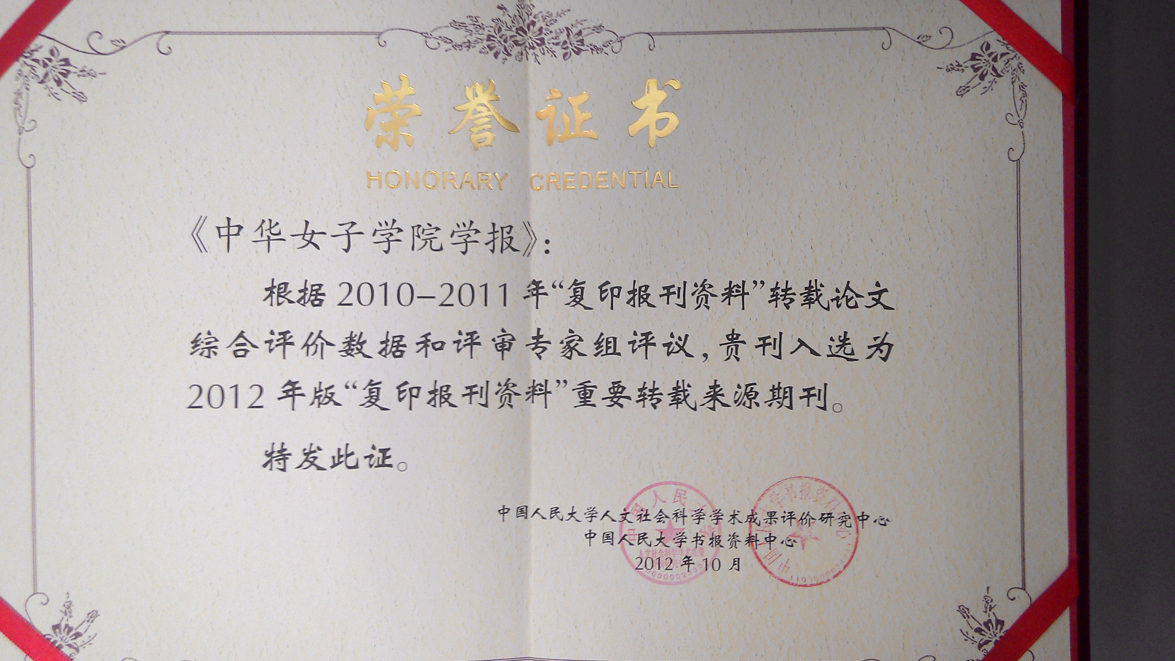 根据2010—2011年中国人民大学社会科学学术成果评价研究中心、中国人民大学书报资料中心“复印报刊资料”转载论文综合评价数据和评审专家组评议,《中华女子学院学报》入选为2012年版“复印报刊资料”重要转载来源期刊。
