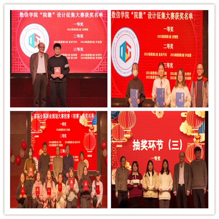 联欢会上首次展现了数信学院院徽,现场为院徽设计者乔希老师颁发了院徽录用证书,并为“院徽”设计征集大赛和“首届全国职业规划大赛校内赛(初赛)”获奖者颁发了证书。