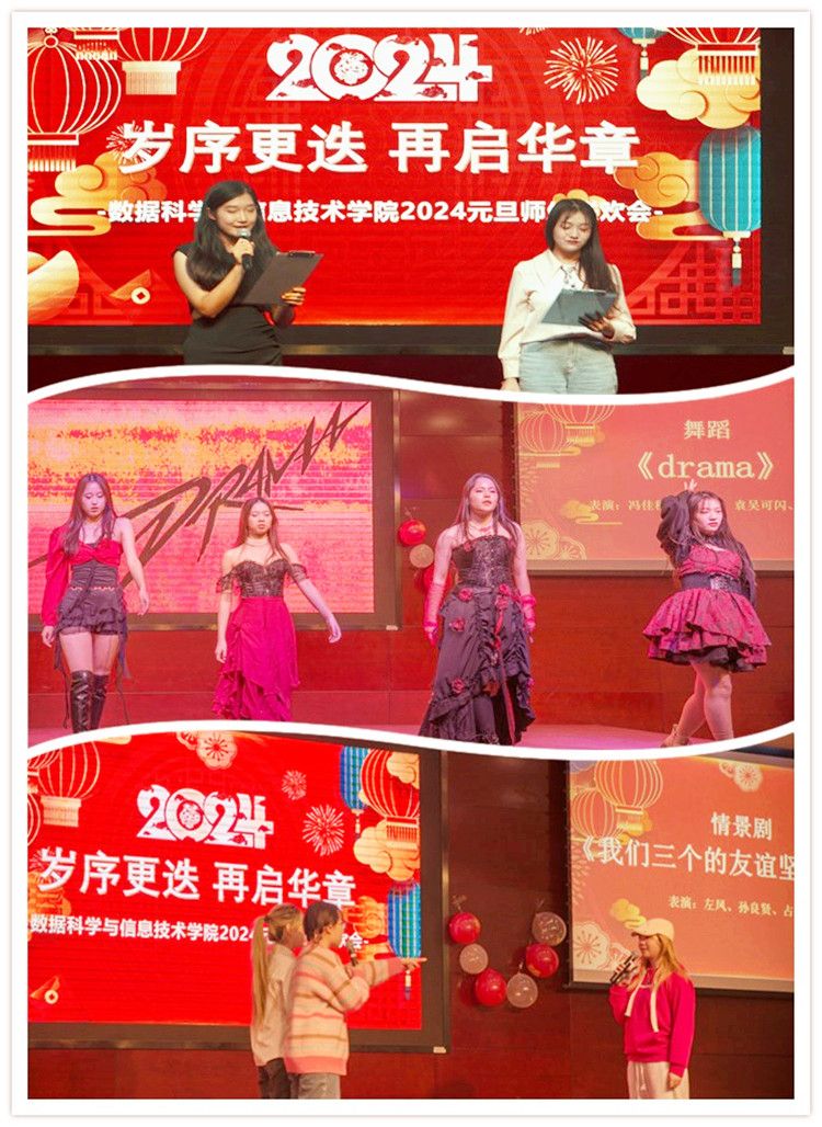 日月其迈,岁律更新。在辞旧迎新之际,12月26日下午,数据科学与信息技术学院在多功能厅举办“岁序更迭 再启华章”为主题的2024年元旦联欢会,学院师生齐聚一堂,载歌载舞,共话收获希望,共迎元旦佳节。