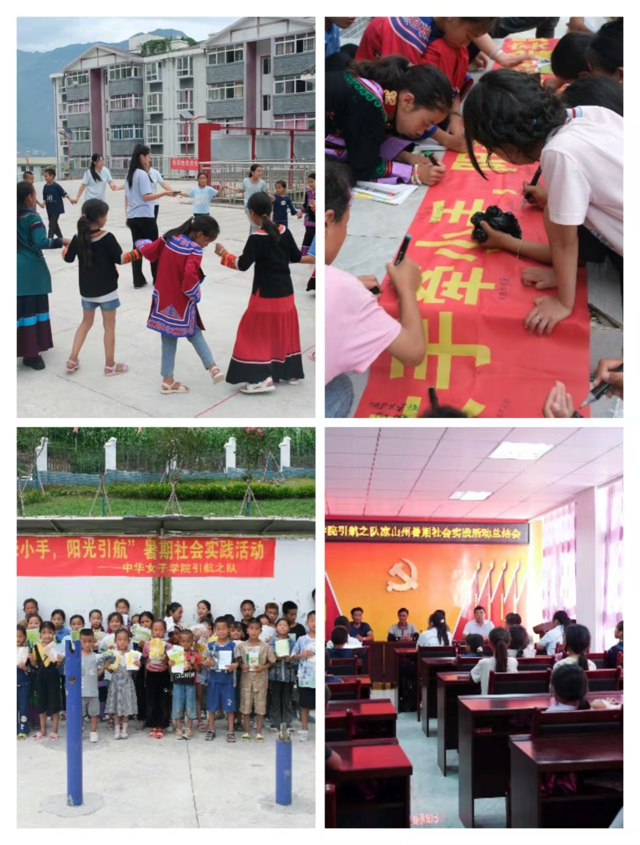 七天时间转瞬即逝。在总结会结束之后,同学们给小朋友们发放了学习用品作为纪念,小朋友们也制作了最珍贵的礼物——在条幅上写下了自己的姓名和祝福的话语送给即将离开的小姐姐们。最后大家一起举行了联欢活动,载歌载舞,共话离别。