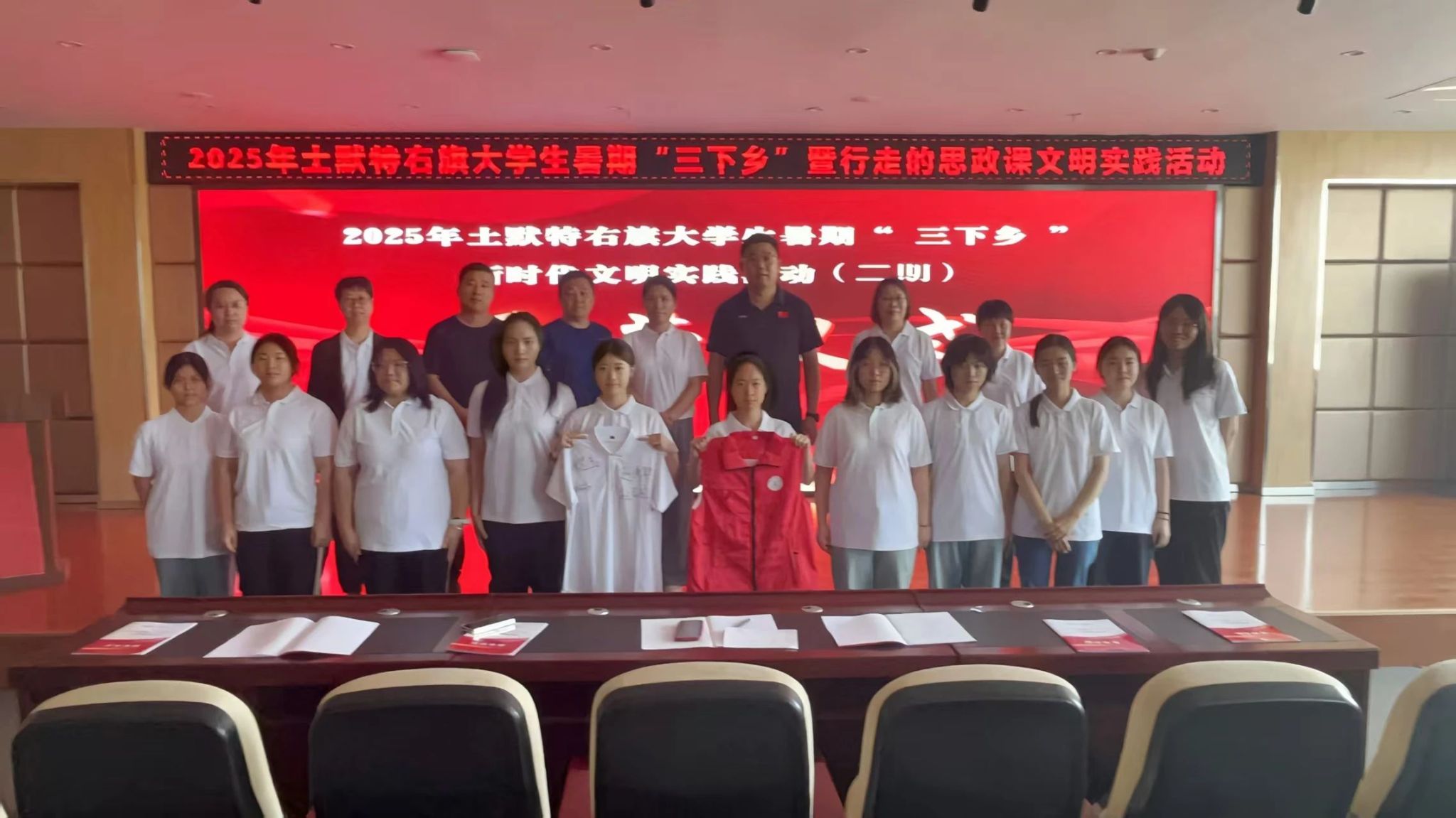 社会工作专业2024级学生陈樱樱代表实践团全体同学发言,她表示:“接过责任的接力棒,我们实践团全体学生已整装待发。在美岱桥村和美岱召村这片热土上,我们将以青春之名,全力以赴:深入课堂启迪智慧,走进村户倾听心声,将知识与关怀播撒乡间,将服务与奉献书写在土右大地!”之后,新时代文明实践活动中心为实践团授旗,双方互换马甲。