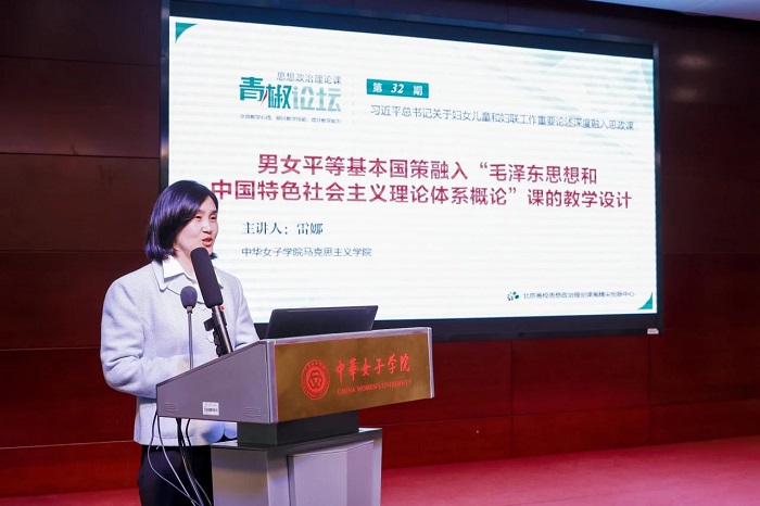第十二届北京高校思想政治理论课教学基本功比赛一等奖获得者、中华女子学院马克思主义学院雷娜老师通过围绕“为什么融”、“融什么”、“怎么融”展示了将男女平等基本国策融入“毛泽东思想和中国特色社会主义理论体系概论”课的教学设计。