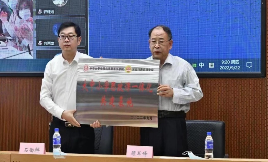 9月22日,中华女子学院马克思主义学院与河北行唐启明中学成功举办 “大中小学思政课一体化共建基地”签约揭牌仪式。仪式在北京和河北行唐同步进行,由马克思主义学院院长王欢教授主持。
