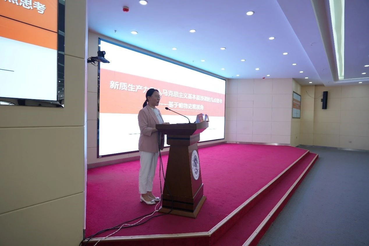 我院任琳老师以“新质生产力融入马克思主义基本原理课的几点思考——基于唯物史观的视角”为题,从四个维度阐述了如何将新质生产力融入到马克思主义基本原理课的教学中。她谈到,从唯物史观维度,要讲清楚新质生产力理论的出场背景与时代价值;从生产力与生产关系的矛盾运动及其规律维度,要讲清楚新质生产力理论与马克思主义生产力理论的内在逻辑关联与原创性贡献;从社会历史发展的动力维度,要讲清楚新质生产力对以高质量发展助推中国式现代化新征程的根本动力作用;从社会主体作用维度,要讲清楚新质生产力理论的价值取向以及青年大学生在发展新质生产力中的责任与担当。
