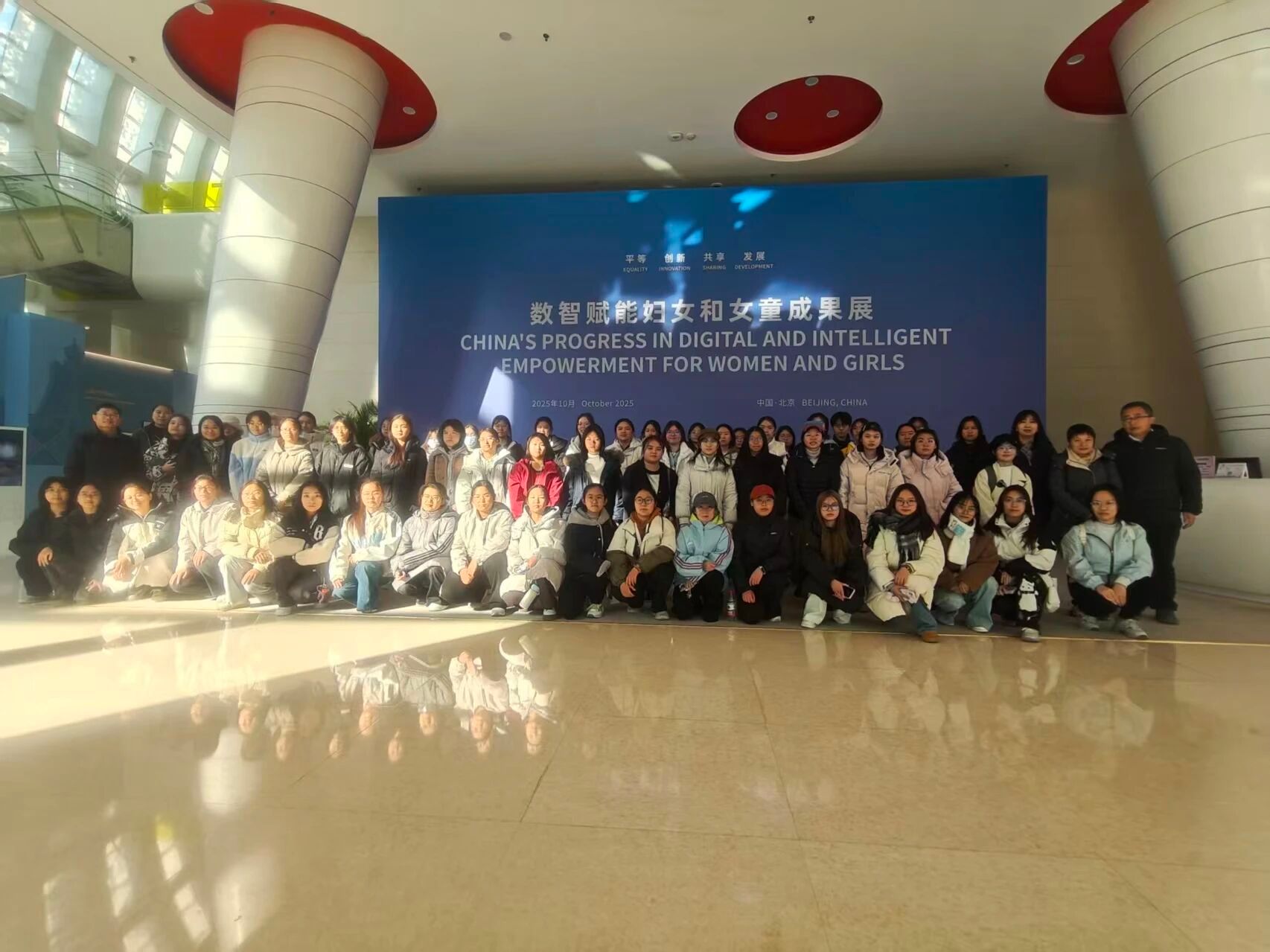 在中国妇女儿童博物馆内,同学们在志愿讲解员的引导下,依次参观了“妇女馆”“儿童馆”“中华好家风馆”“国际友谊馆”“妇女发展成就展”“数智赋能妇女和女童成果展”等主题展厅。展厅中丰富的历史图片、珍贵的实物资料、生动的场景复原以及现代化的多媒体展示,系统再现了从古至今、特别是近代以来中国妇女在争取民族独立、人民解放和国家富强伟大征程中的奋斗足迹,展现了儿童事业的发展进步以及中华民族重视家庭家教家风的优良传统。“数智赋能妇女和女童成果展”以翔实的图文数据、生动的互动体验和丰富的实物案例,全面展示了数字技术在促进妇女创业就业、参与政治社会生活、提升受教育水平、保障健康福祉以及弘扬优良家风等方面发挥的巨大作用。