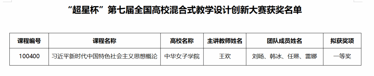 近日,“超星杯”第七届全国高校混合式教学设计创新大赛获奖公示名单揭晓。我校马克思主义学院院长王欢教授带领的教师团队凭借主讲课程《习近平新时代中国特色社会主义思想概论》在激烈角逐中脱颖而出,获得一等奖,实现了我校在该项全国性高水平赛事中的零突破,标志着我校在混合式教学改革与创新领域迈上了新的台阶。