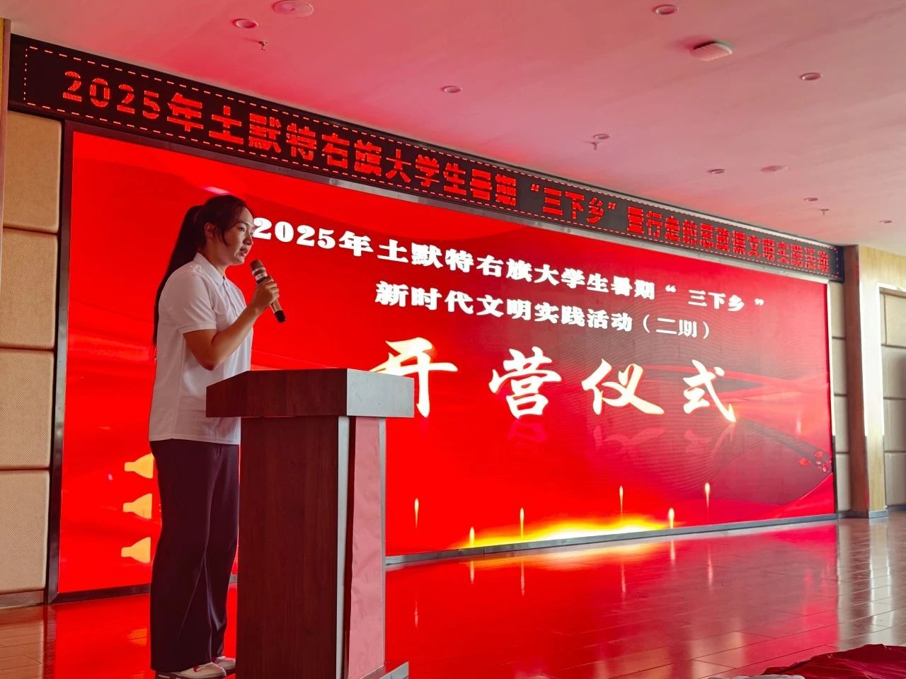 当天下午,实践团抵达土默特右旗,与土默特右旗新时代文明实践服务中心携手,举行开营仪式。土默特右旗新时代文明实践服务中心主任耿慧玉对实践团多年以来的努力与付出表示感谢。他热情欢迎实践团师生第三次到来,希望土右旗成为每一位师生的“第二故乡”,一句饱含深情的“欢迎回家”,令在场师生倍感亲切与温暖。