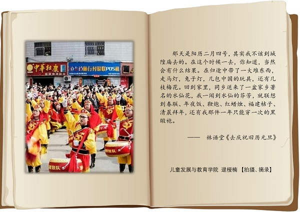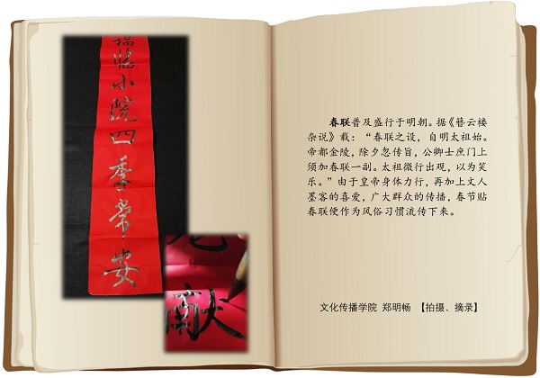 新学期伊始,借着新年的余温,我们收到了各位参与者发来的活动资料,浓厚而又温馨的年味被一张张照片、一段段文字描绘着、记录着,让我们看到了习俗中透露的人文情怀和历史记忆。特将来稿整理分享如下,与全校师生共同回味。