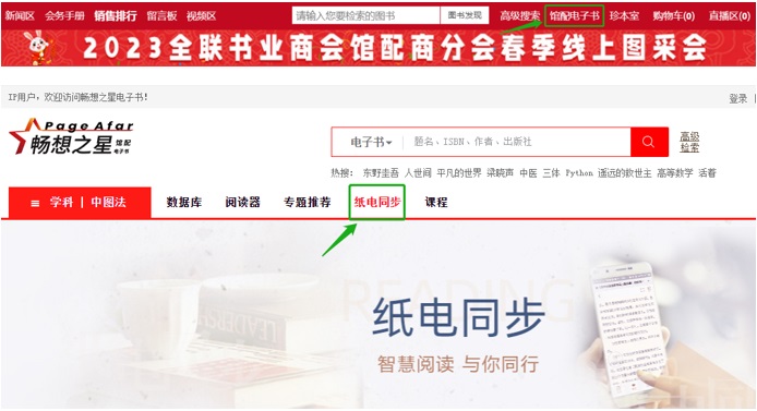 3、馆配电子书:点击首页【馆配电子书】,可跳转至畅想之星平台,点击【纸电同步】,可在线试读图书。电子书仅做参考,可直接选购纸质图书。如需购电子书可联系图书馆老师。