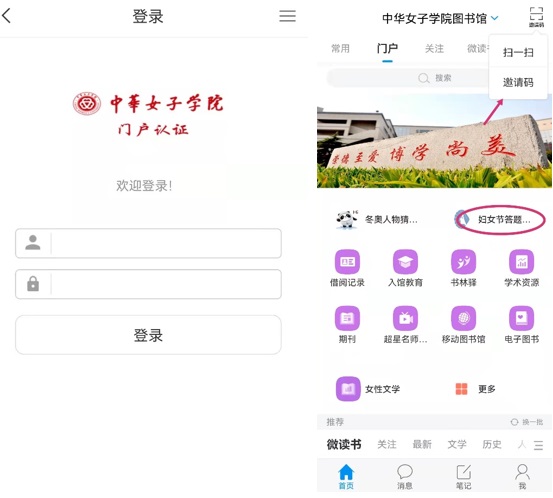 下载学习通APP,老朋友直接登录学习通,在首页右上角输入邀请码:zhnztsg,进入中华女子学院图书馆首页,点击妇女节答题图标进入活动,即可在活动开始后参加。