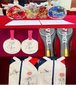 活动最后,我们邀请两位冠军在球拍与球衣上签名留念,学生们送上由文化传播与艺术学院学子们亲手制作的永生花,以花致敬热爱与坚守,以心铭记这场相遇与陪伴。